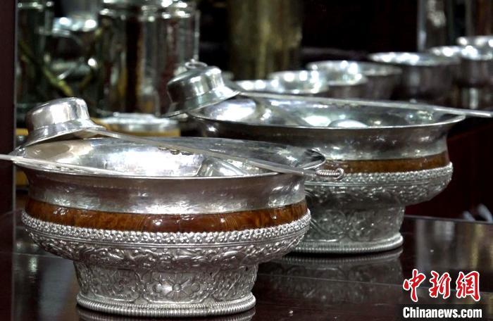 图为扎西吉彩匠东谈主打制的包银木碗。贡桑拉姆 摄